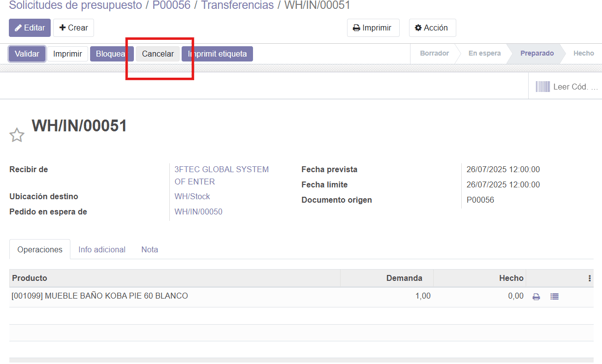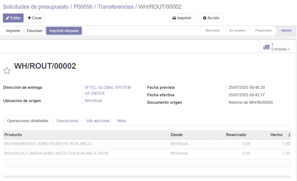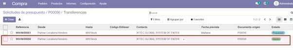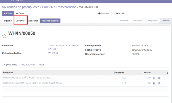4 Paso: volvemos a las transferencias del pedido y entramos en la línea que se ha creado de forma automática, entramos y validar devolución