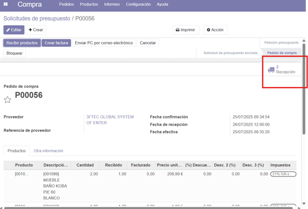 1 Paso: entrar en el pedido e ir a la parte de recepciones