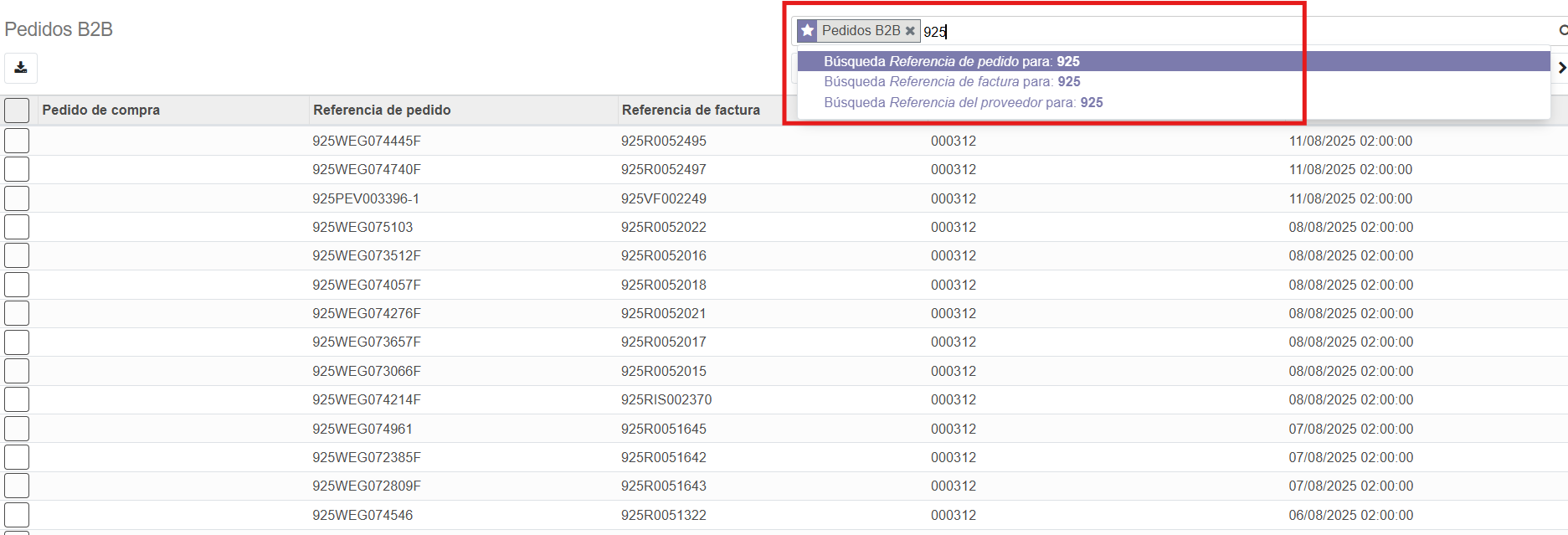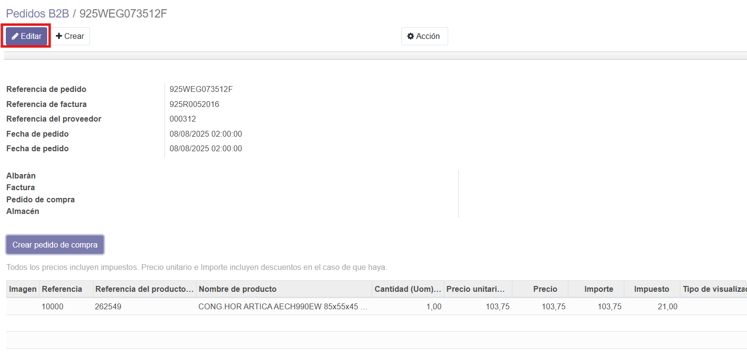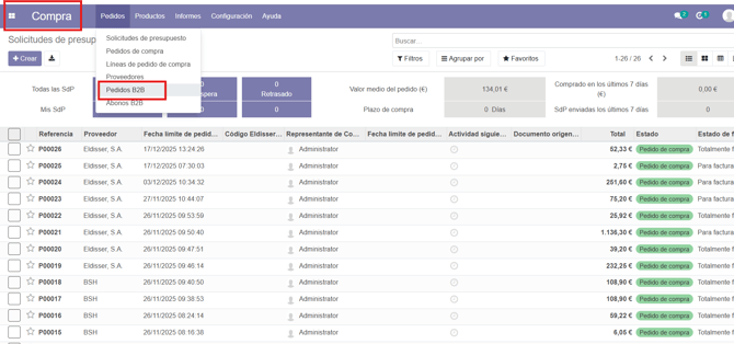Entramos en el módulo de Compras. Una vez allí, debemos ir a Pedidos B2B y buscar el pedido, lo cual se puede hacer tanto por número de pedido como por número de factura.
