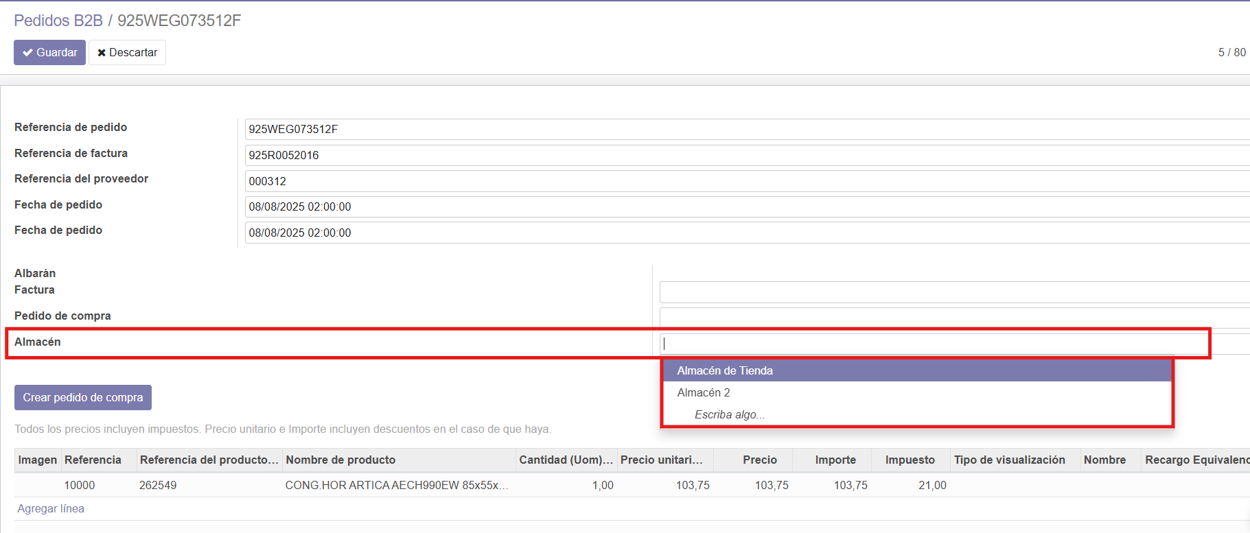 Nos posicionamos sobre la línea que queremos introducir y presionamos Enter. Una vez dentro, debemos dar a “Editar” y seleccionar el almacén donde queremos recibir la mercancía.