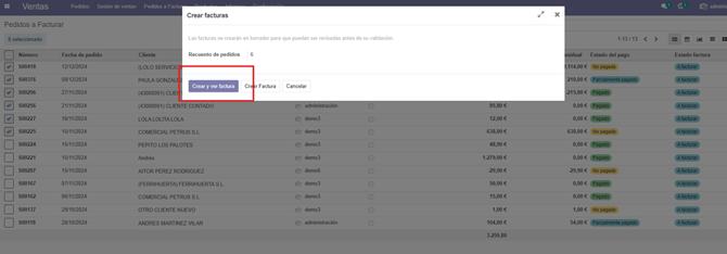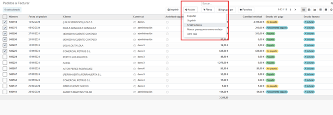 ¿Cómo puedo crear una factura para varios tickets? Pedidos a facturar Seleccionar pedidos Acción-crear factura Crear y ver factura Factura