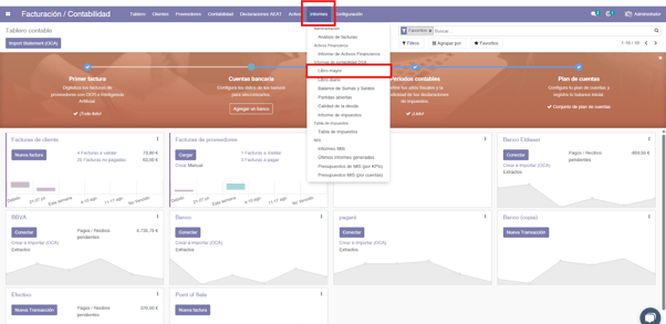 Una vez dentro, pulsamos sobre Informes y seleccionamos la casilla Libro Mayor.
