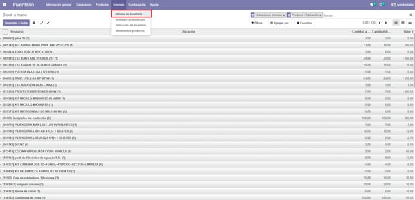 Entramos en el módulo de Inventario, vamos a Informes y seleccionamos Informe de inventario