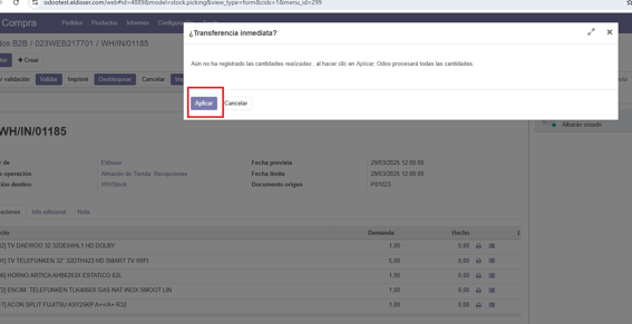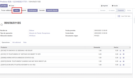 Ahora solo falta Validar para que la mercancía entre en mi stock