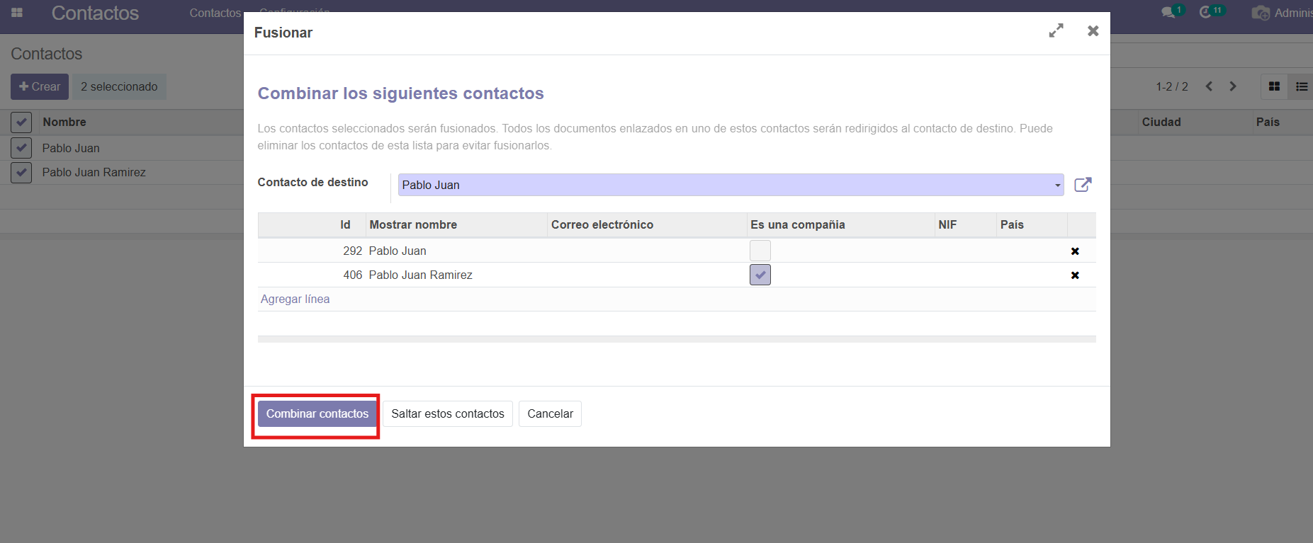 Seleccionamos cuál va a ser el contacto principal y presionamos sobre Combinar contactos