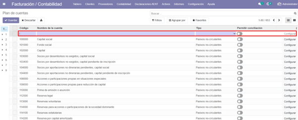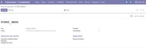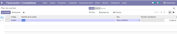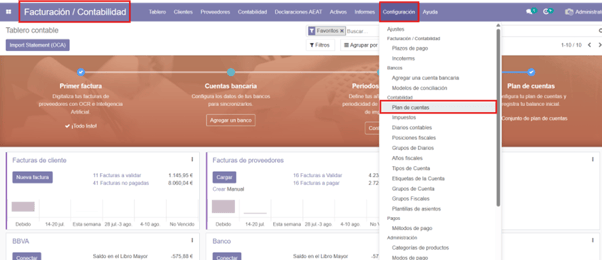 Entramos al módulo de Facturación y contabilidad. Configuración, Plan de cuentas.