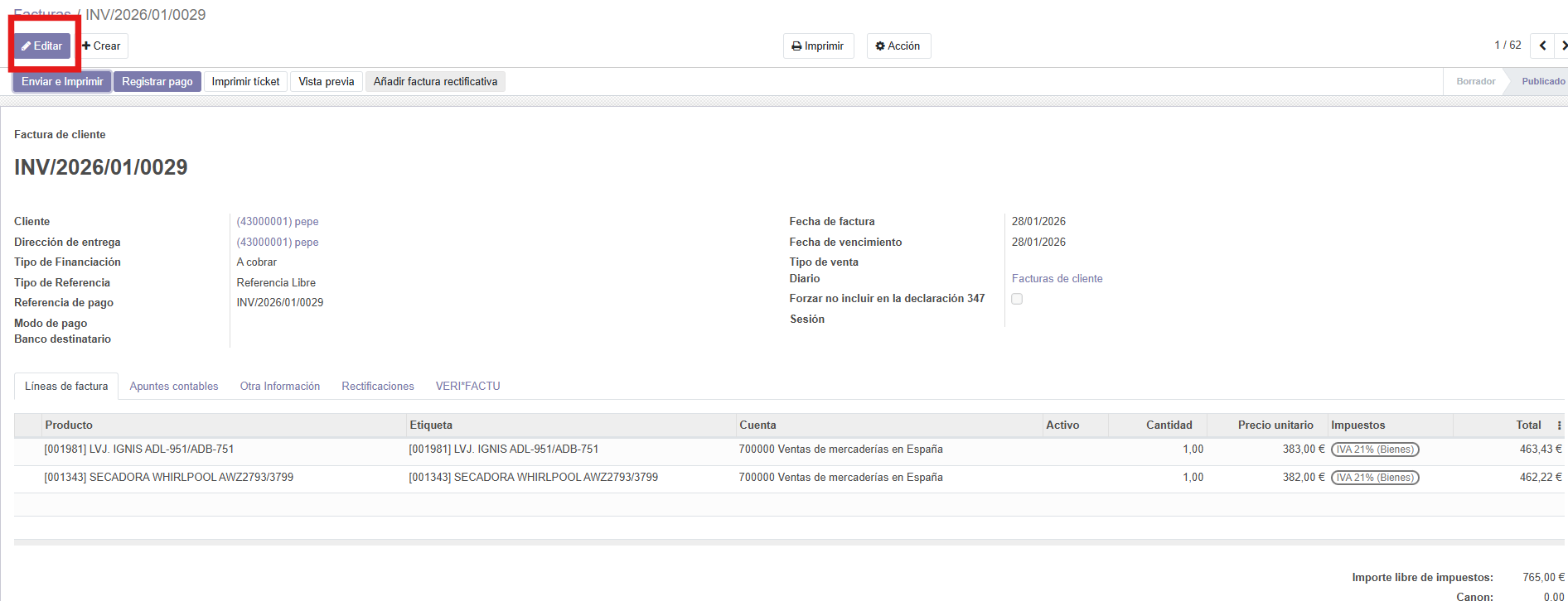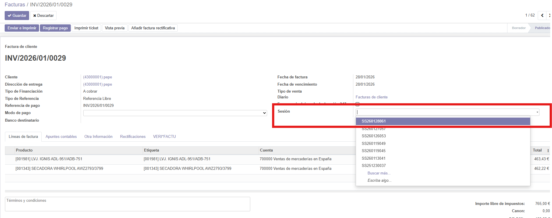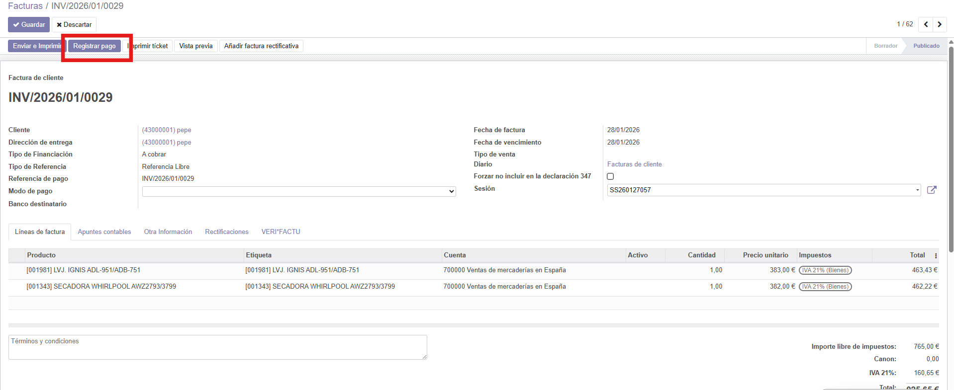 Entro en la factura que me indica como no pagada