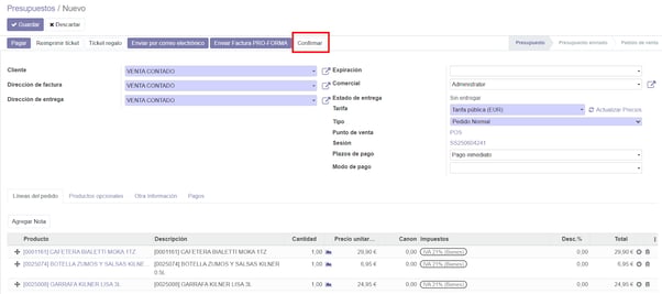 Seleccionamos el cliente, introducimos los artículos y confirmamos el pedido