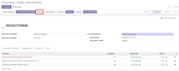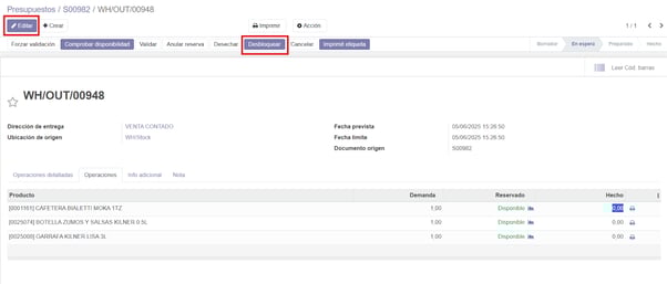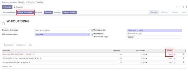 Introducimos las cantidades a entregar y seleccionamos ‘Marcar por realizar’