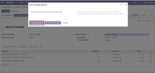 Marcamos ‘Crear entrega parcial’