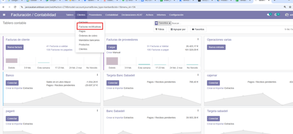 Una vez dentro, pulsamos sobre la casilla Clientes, y a continuación sobre Factura rectificativa.