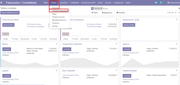 Con el ratón nos colocamos encima del botón clientes y seleccionamos la opción de facturas rectificativas