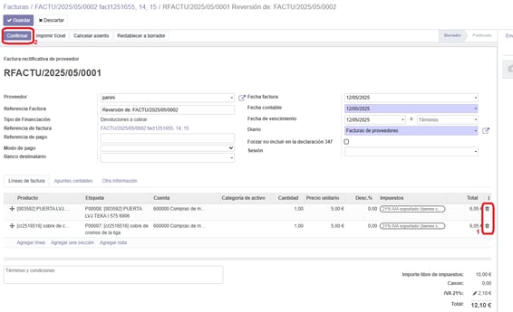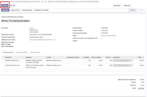 Pulsamos el botón editar y dejamos solos los productos de los que se quiere hacer la devolución