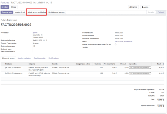 Entramos en el módulo de Facturación/contabilidad, seleccionamos la factura original y pulsamos en el botón de añadir factura rectificativa.