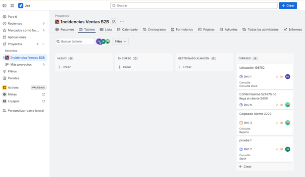 Proyecto: Seleccionaremos siempre el proyecto "Incidencias Ventas B2B (INC)