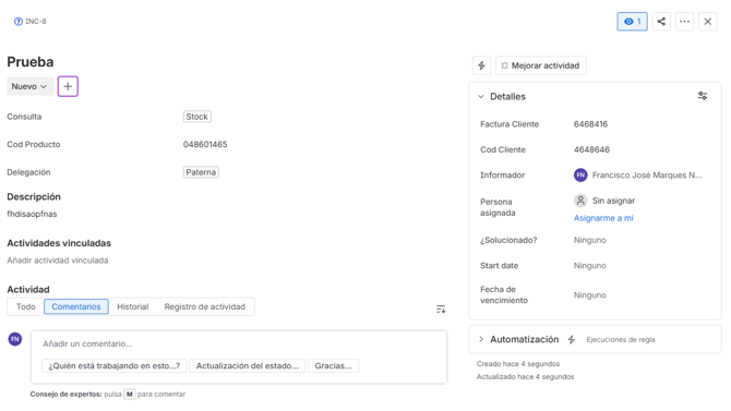 Importante: En caso de que gestionemos la incidencia y sepamos que depende José Valls, le asignaremos directamente la tarea a él, y la volveremos a pasar a estado nuevo.