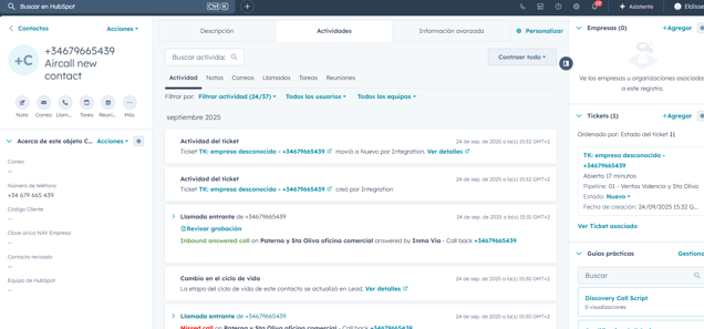 Asegurémonos de guardar los cambios para que la llamada quede registrada en el historial del contacto. Esto permite que todo el equipo tenga visibilidad de las interacciones y se mantenga un seguimiento ordenado.