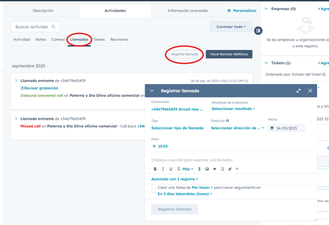 Dentro de la ficha del contacto, busca el apartado de Llamadas y haz clic en Registrar llamada.