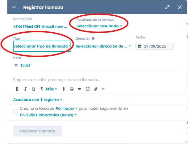 Tipo de llamada: seleccionamos la etiqueta que corresponda, igual que cuando registramos cualquier otra llamada.