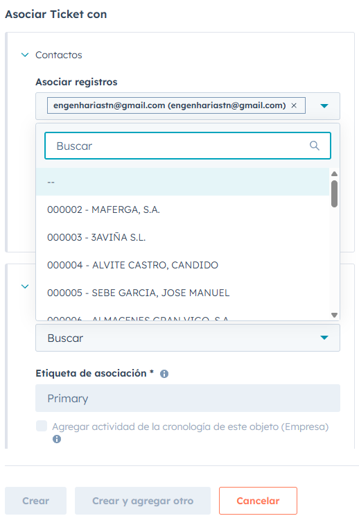 7.- Mientras que en el apartado contactos, siempre tendremos asociado el ticket al contacto que hemos abierto, es posible que tengamos que asociar el ticket también a la empresa, para ello, buscaremos a la empresa con su correspondiente código de cliente. En caso de no aparecer, se tendrá que reportar a Fran.