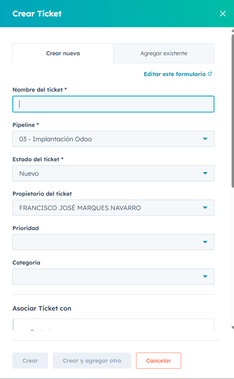 3.- En el campo ‘Nombre del ticket’, indicaremos el código de cliente, acompañado de la categoría y subcategoría correspondiente. Por ejemplo: 2816 - “Incidencia - Producto defectuoso”.