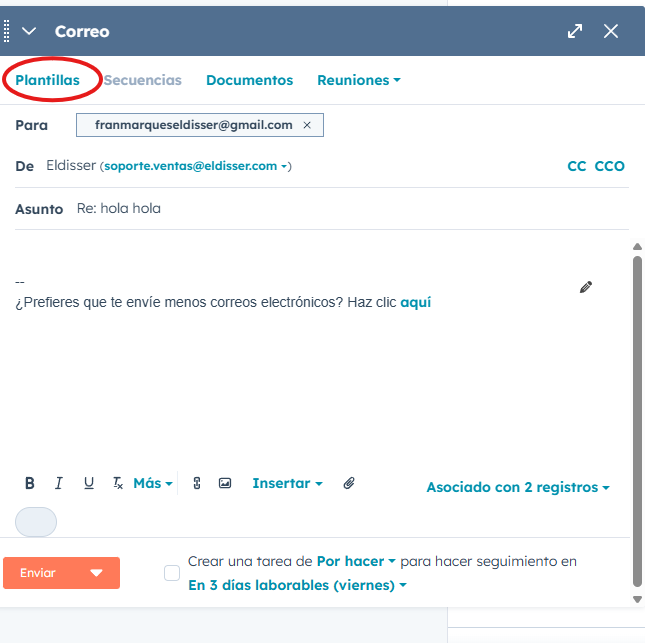 Inicialmente le solicitaremos el código de cliente para poder revisarlo mediante un mail, para ello, podremos utilizar la plantilla llamada Petición código de cliente. Cuando vayamos a redactar el correo podremos seleccionarla de la siguiente forma: